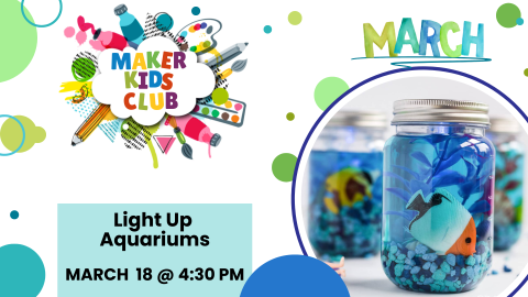 Kids ages 7-12 are welcome to join us for the March meeting of the Maker Kids Club! This month, we will be making Light Up Aquariums. We love this craft because they can be displayed on a nightstand or offer a calming light to wind down.